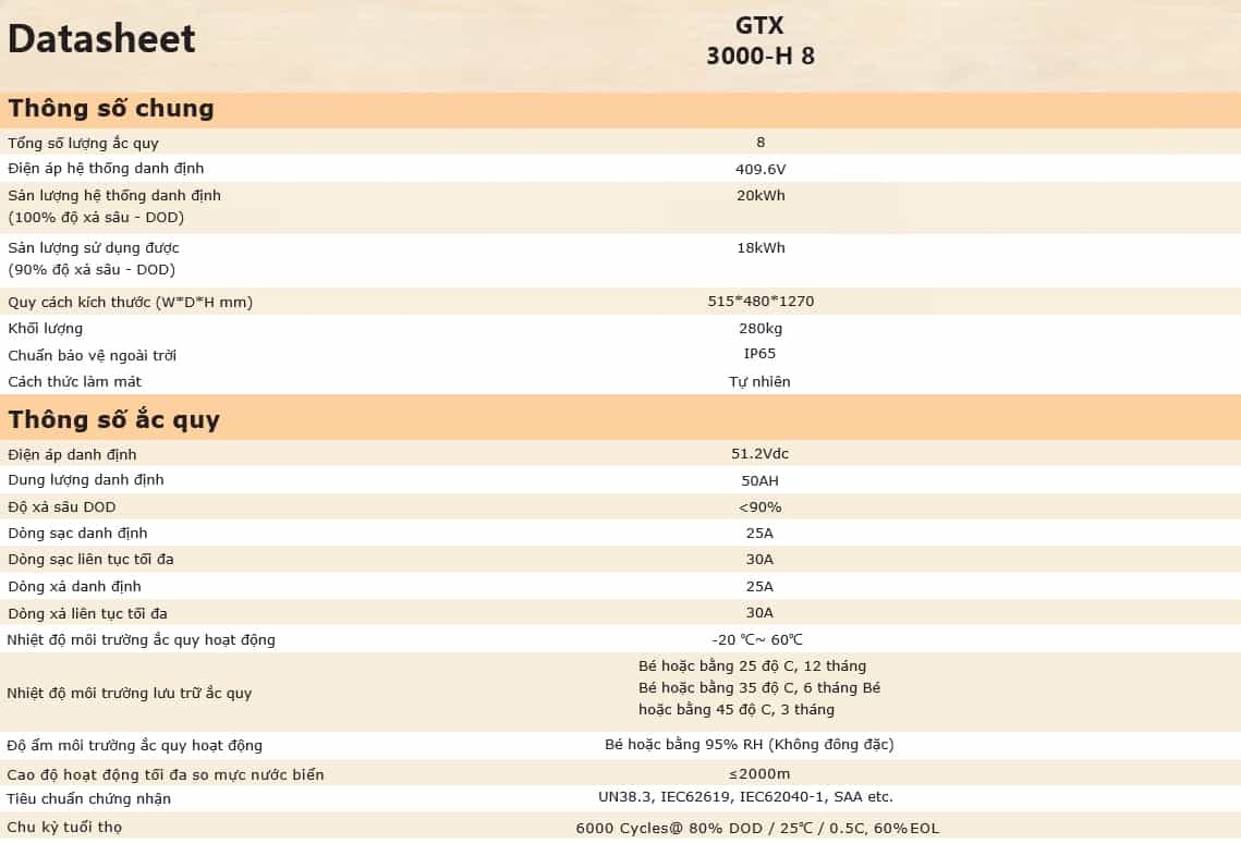 Thông số kỹ thuật Pin lưu trữ Lithium Sofar 20KW (GTX3000-H8) 3pha